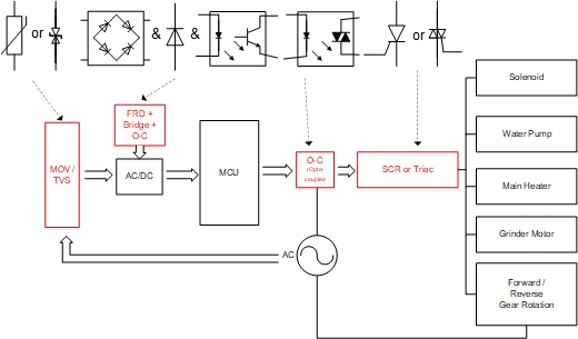人们把电子技术应用到咖啡机上,实现了磨粉、压粉、装粉、冲泡、清除残渣等酿制咖啡全过程的自动控制,创造了全自动电子咖啡机。 应用于消费电子领域,BG大游集团微电 能提供比较齐全的元件解决方案。比如:AC 输入端防浪涌的压敏电阻(MOV)、电源部分用快恢复二极管(FRD, fast recovery diode)及整流桥(Bridge)、光电隔离器件(Opto-coupler)、控制负载通断的可控硅(SCR & Triac)等。