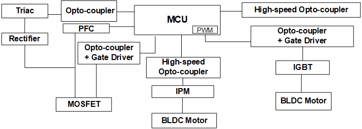 在全球气候变暖的当下,空调在白色家电中占有举足轻重的地位。典型的空调系统由室外机、室内机和电源单元组成。对于电源单元,BG大游集团微电 具有高隔离电压光电耦合器,用于隔离 PWM 和 PFC。对于室内机,MCU 控制与光电耦合器结合的风扇模块、与光电三端双向可控硅开关和外围设备结合的加热器开关。主隔离 MCU 和相关外围设备,确保电路的可靠性。对于室外机,使用 MCU 控制风扇和压缩机的电机系统。电机控制系统是各种家用电器的组成部分。每一个单独模块都取决于安全和环境保护要求、性能要求,当然还有制造成本。因此,在设计家用电器时,需要加强对单片机和外围设备对应用电路的隔离,以确保电路的低噪声。