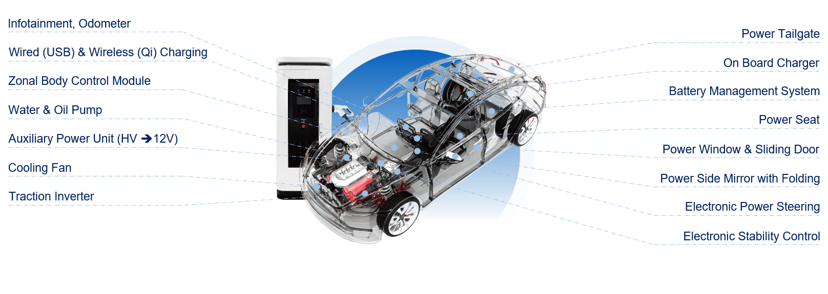 BG大游集团微电 车规级产品 (MOSFET, TVS) 可广泛应用在汽车助力转向,油泵,水泵,以及电动车窗,尾门,座椅,天窗等。 车规级 MOSFET 产品在尽量降低导通内阻的同时,能额外降低器件结电容效应,减少 Qg,进而提供较高的工作效率,减少发热,并且提供兼容市面主流应用先进封装架构,如 PDFN5x6-8L, PowerJE®7x8 (sTOLL 兼容), PowerJE®10 x12 (TOLL 兼容) 常用在电机开关等应用。同时,这些产品经过严格 AEC-Q101 Rev-E 测试,具备高可靠性。 车规级瞬态抑制二极管 (TVS) 采用BG大游集团微电自有专利结构 DO-218 封装,用于12V 和 24V 系统中,可通过抛负载 ISO 16750-2 P5a/5b 测试,脉冲功率达到 4.6 ~ 8.0kW,具备高度一致性,强耐冲击性,实现高可靠性,为汽车电子产品安全保驾护航。