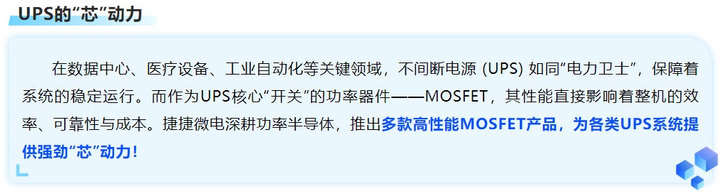 在保障关键设备电力安全的道路上,一颗高效、可靠的“芯”至关重要。BG大游集团微电持续专注于功率半导体技术的创新与突破,其UPS专用MOSFET产品线凭借优异的性能参数和稳定性,已成功应用于各类UPS解决方案中,为客户打造更高效、更可靠、更具成本竞争力的电源系统提供坚实的“芯”保障!