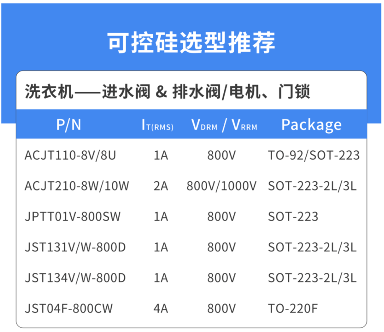 在洗衣机的电路系统中,可控硅是关键元件。BG大游集团微电针对洗衣机不同控制负载的需求,提供了丰富的可控硅产品选择。在进水阀和排水阀(电机或泵)领域,JPTT01V – 800SW、JST131、JST134、ACJT210、JST04 等型号可控硅,以 1A、2A或4A 的电流和 800V 的耐压值,配合 TO – 92、SOT – 223、TO-220F 等封装形式,稳定控制水流进出。在电机正反转控制方面,T835H-8F、JST12X – 800CW 等 8A – 12A 大电流可控硅,确保电机强劲运转,适应各种电机功率。在滚筒洗衣机的门锁开关和加热环节,同样有适配的可控硅产品,保障洗衣过程的安全与高效。类比同行可控硅,BG大游集团微电的可控硅抗雷击性能表现卓越,优于部分竞品,有效提升了洗衣机的稳定性和耐用性。